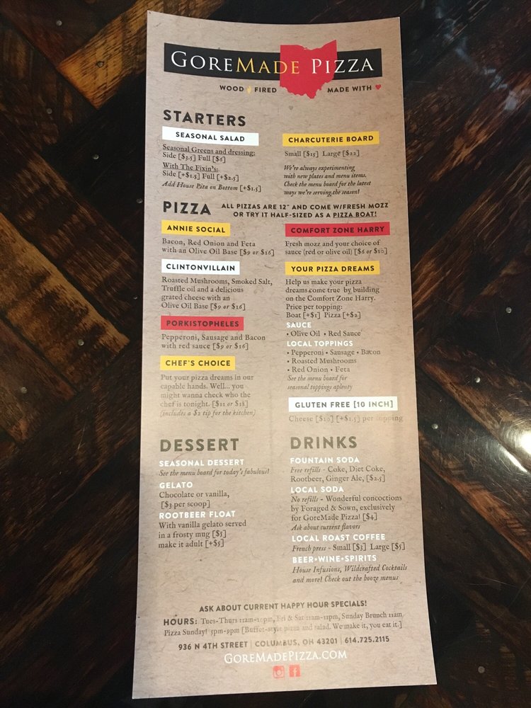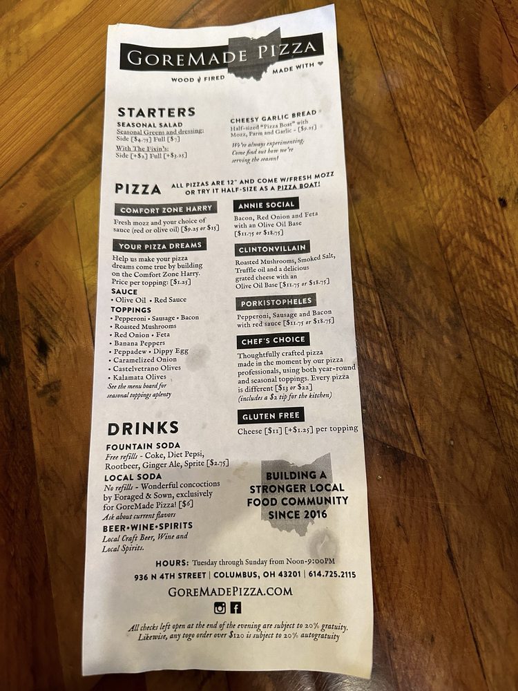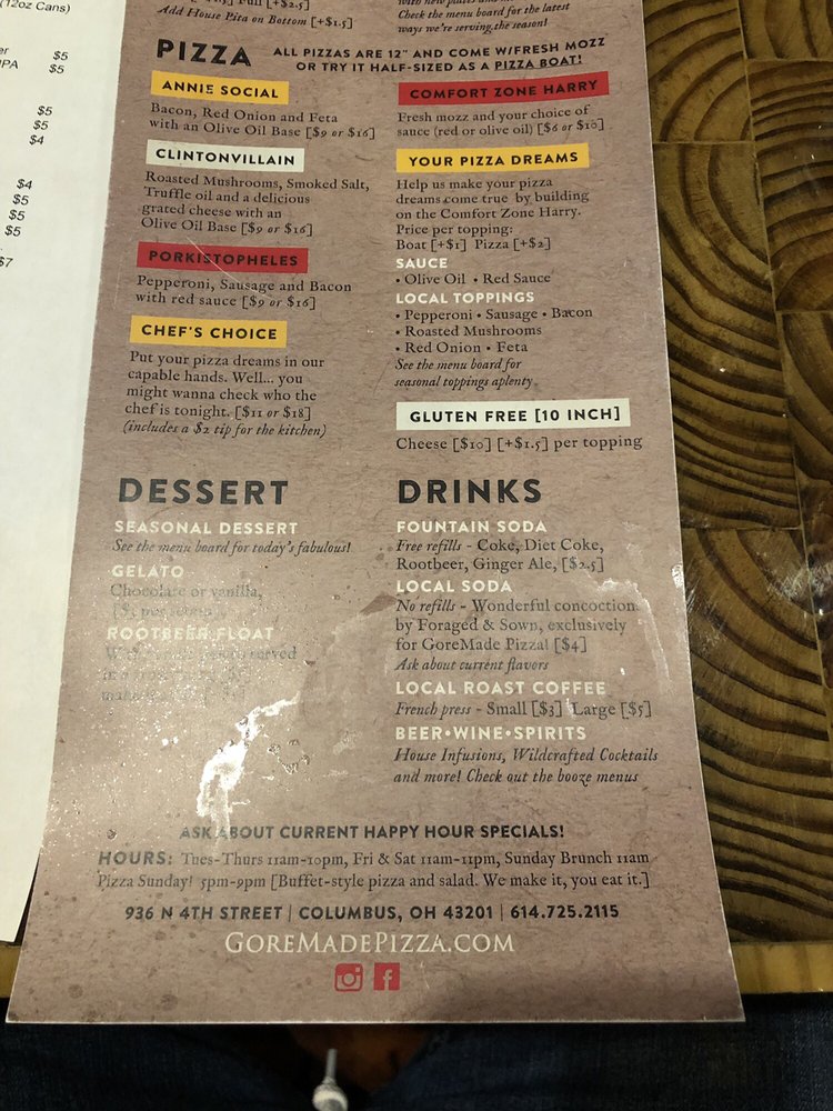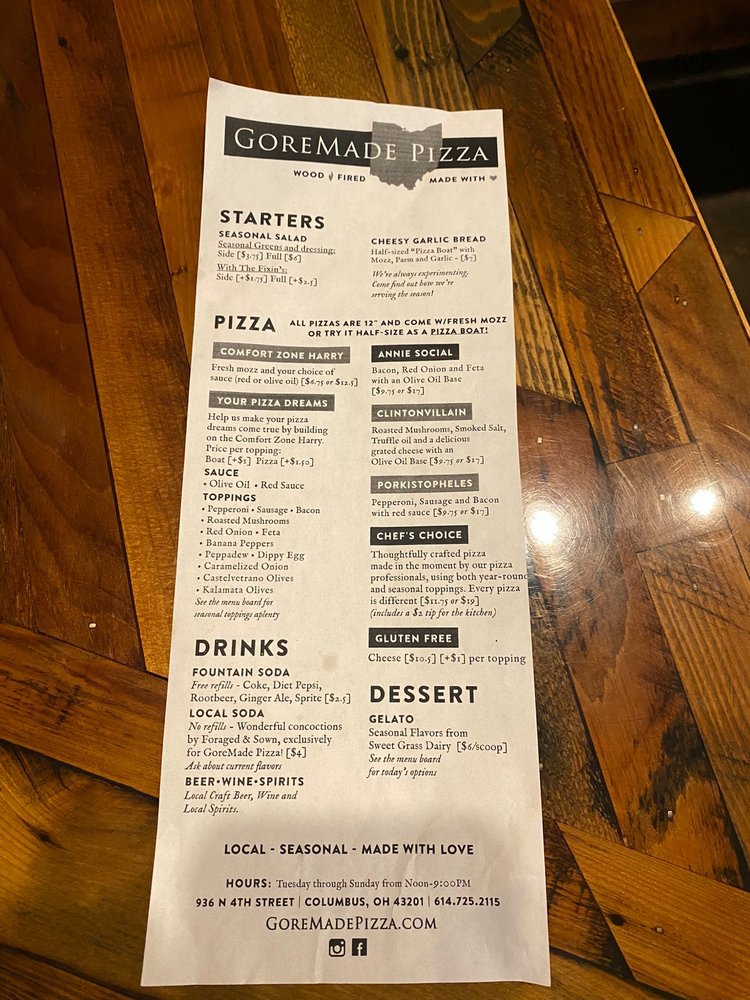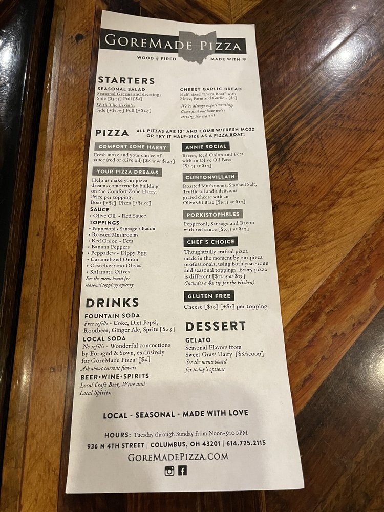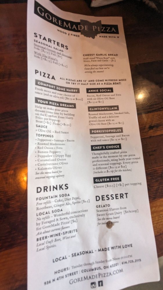 Welcome to GoreMade Pizza, a hidden gem in Columbus offering outstanding pizzas with a personalized flare. The dough is perfectly cooked with a rustic char, topped with fresh local ingredients, and a basic tomato sauce that hits the spot. Customers rave about the unique toppings and must-try cheesy garlic bread. The menu includes round 12 pizzas or the option for a half-sized pizza boat. The casual ambiance, fun decor, and friendly service make dining here a memorable experience. Whether you're a thin-crust pizza enthusiast or looking to try something new like their pesto pizza, GoreMade Pizza is sure to impress. With happy hour specials, a full bar, and outdoor seating available, it's the perfect spot for lunch or dinner. Don't miss out on this top 10 pizza joint in the area - your taste buds will thank you.